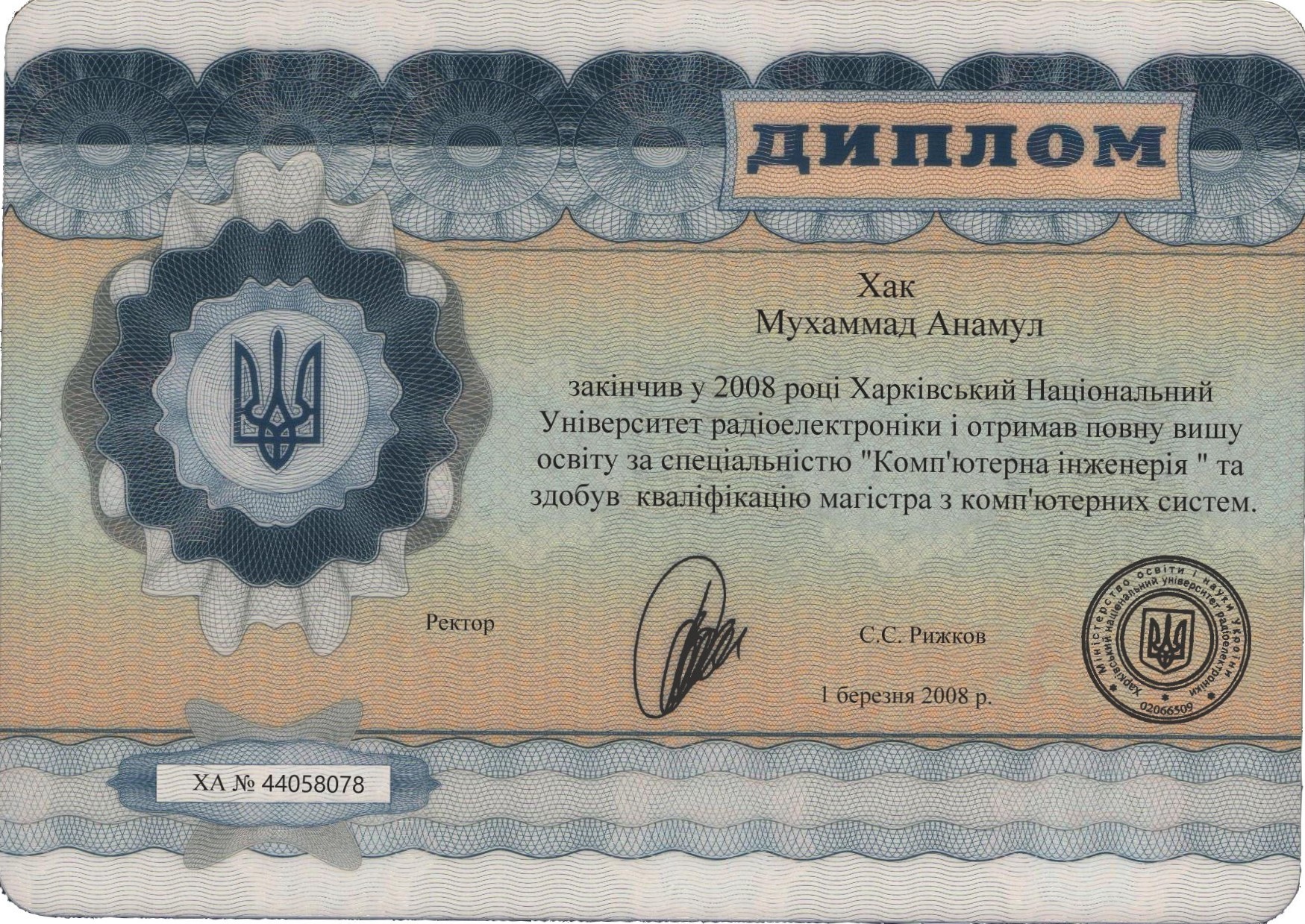 Master of Computer Science and Engineering , Kharkeiv National University of Radio and Electronics (KHNURE)[Foreign Institute], First Class, Marks :87% passing year:2008